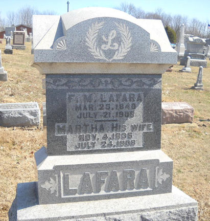 Headstone next to plant is William and Sarah Lafara, headstone in center is Uva Lafara Ratchford, military headstone is William Sanders, tall headstone to his left is Catherine Landon Lafara Sanders and headstone to her left is Jesse Lafara.